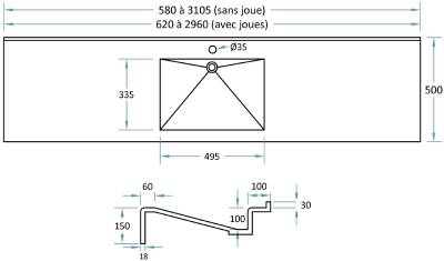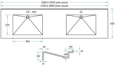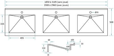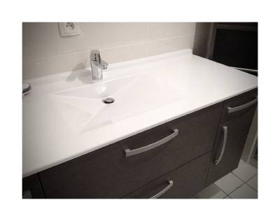 Plan simple, double ou triple vasque Vasques centrées ou décentrées Avec ou sans trou de robinetterie Bandeau frontal jusqu'à 150 ou 200 mm Couleurs personnalisables