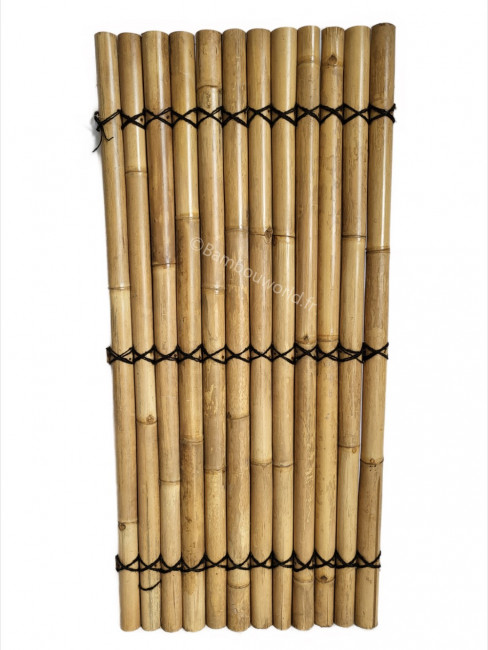 Les demi-bambous, d’une couleur naturelle, ont une largeur entre 6-8 cm et sont fixés sur des lattes en bambou avec une finition en corde de palme sur trois niveaux.