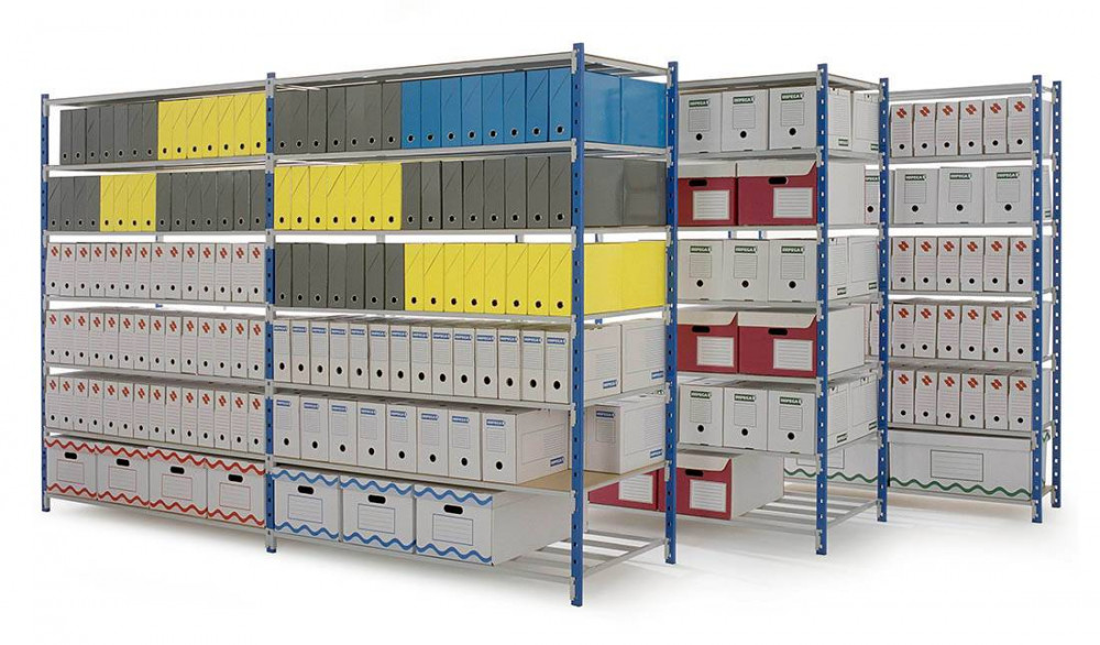 Comme l'indique son nom, ce rayonnage est destiné principalement pour l’entreposage et le stockage d'archives. Ces archives peuvent être stockées dans des classeurs, des boites en cartons ou en PVC, entreposées dans des caisses en carton ou dans des dossiers suspendus.