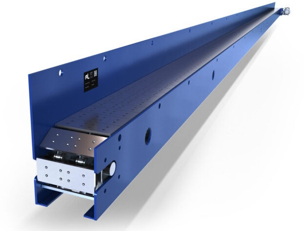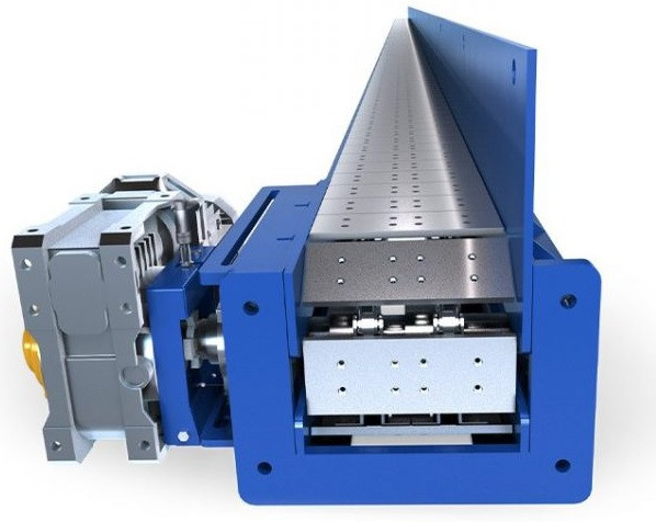 Ce convoyeur à plateaux long est un équipement industriel destiné au transport de profils et de pièces de grandes dimensions.