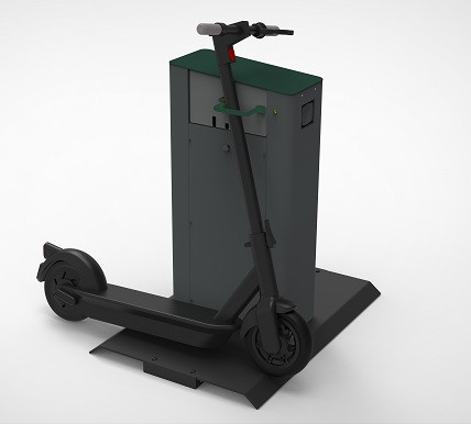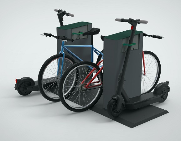 Adaptée à un usage intérieur et extérieur, la borne de recharge et station de parking permet de sécuriser et de charger à la fois les vélos et trottinettes électriques.