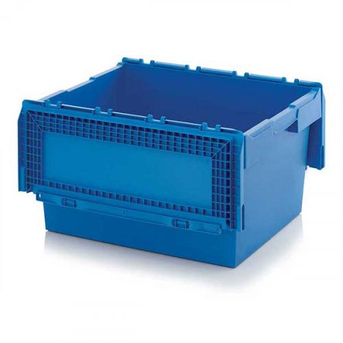 Le couvercle à charnière droit intégré à ce bac navette de transport en polypropylène assure une fermeture fiable, sans élément déporté à gérer ou à stocker séparément.