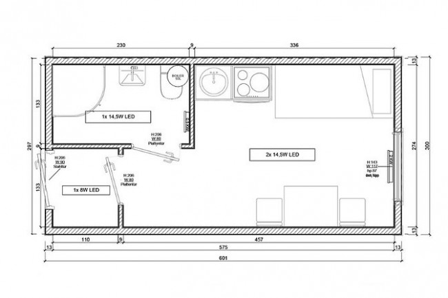 Sol : Tôle galvanisée de 0,5 mm avec isolation en laine de façade pressée de 100 mm. Revêtement intérieur en plaque OSB de 22 mm, structure en bois et plancher en PVC.