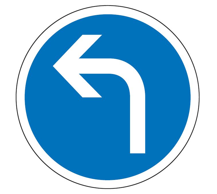 Ce panneau de type B21c2, fabriqué en France, indique à l'automobiliste qu'il doit tourner à gauche à la prochaine intersection.