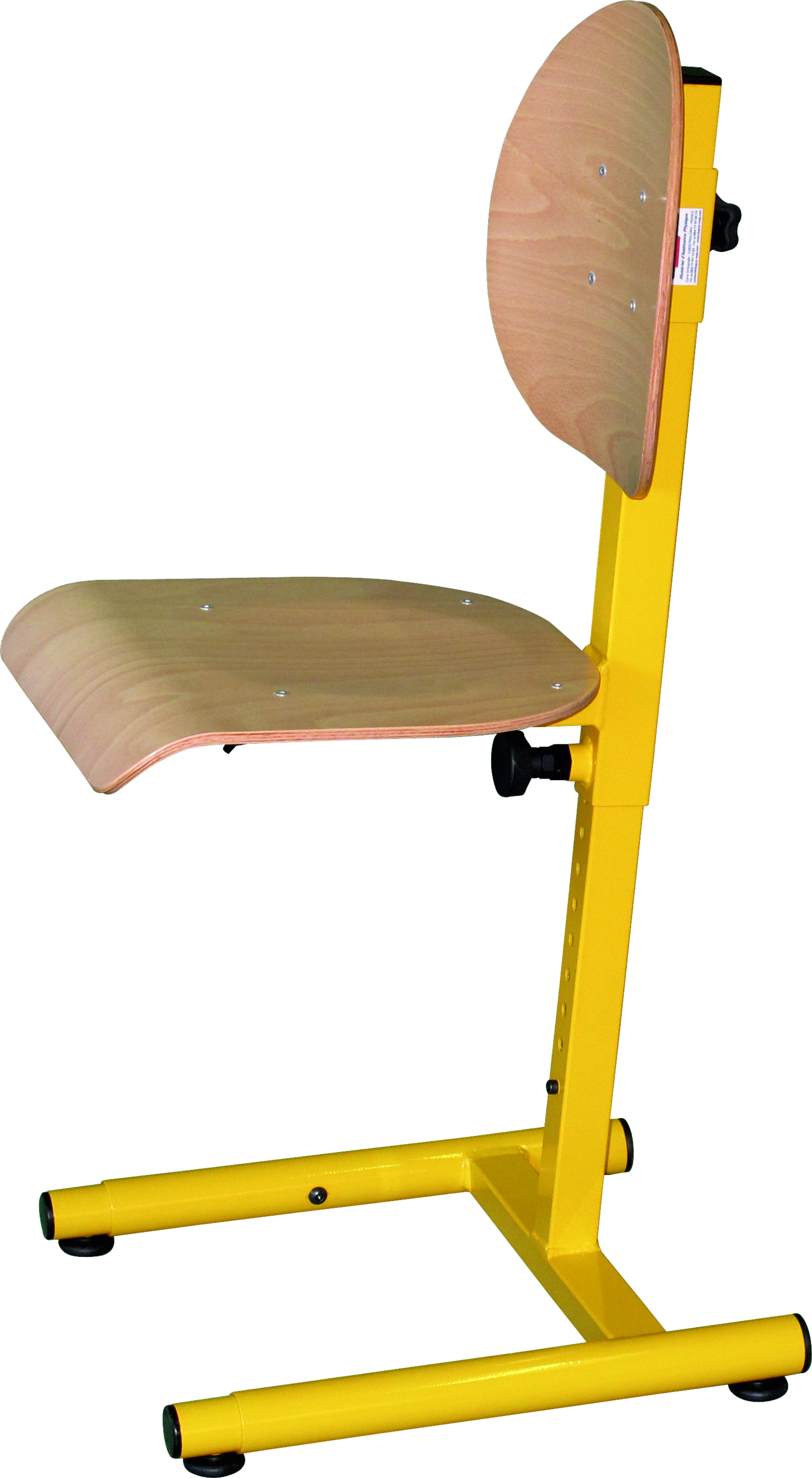 Hauteur réglable de 300 à 500 mm (du sol au dessus de l’assise) par crans (tous les 25 mm soit 9 hauteurs possibles) avec bouton moleté (dessous l’assise).
