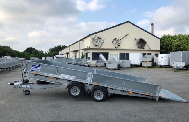 remorque 2 essieux basculante mini 3.6 m de charge utile interieur et 2 m de large avec ridelle sur le cote plus porte arriere rampe 1m de hauteur