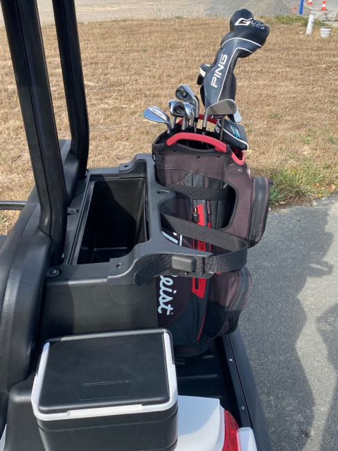 La golfette est équipée d'un chargeur embarqué, ce qui signifie que vous pouvez la brancher sur une prise 220V standard pour recharger facilement la batterie.