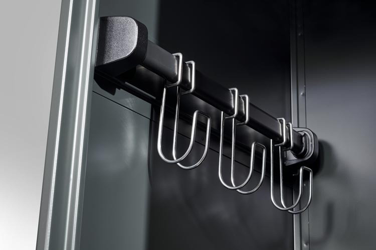 En dessous, 1 tringle à vestiaire stable en section ovale supporte les tenues lourdes grâce à 3 crochets coulissants doubles anti-torsion qui maintiennent parfaitement les vêtements.