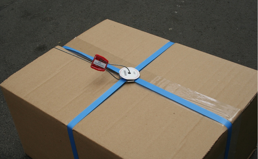 Set composé d'un scellé câble rouge et d'un feuillard métallique repliable pour sécuriser les caisses et palettes.