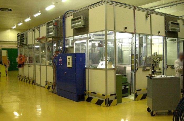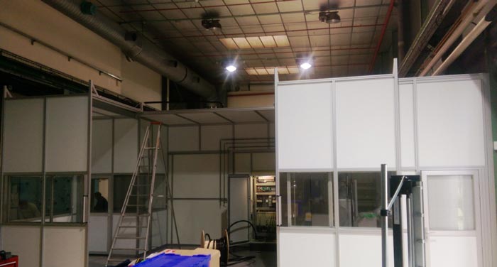 - 10 cabines de 2500 mm(l) x 3 000 mm (h) équipées de tables tournantes à hauteur réglable de diamètre 700 mm et recevant des pièces de 30 à 60 kg.