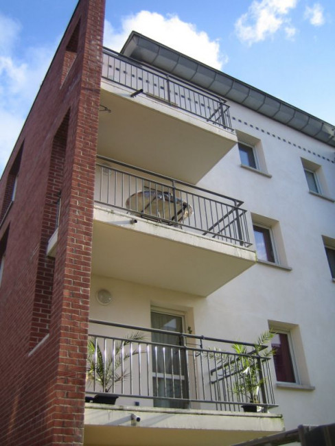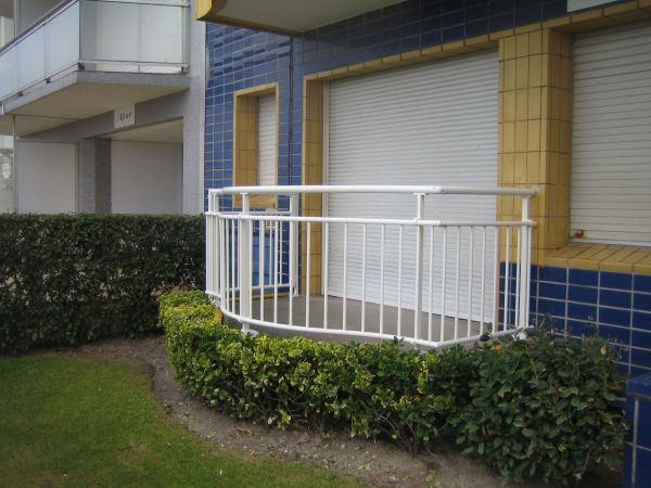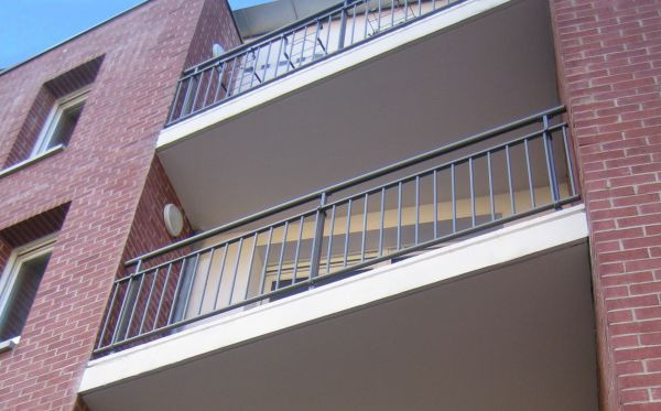 - Garde-corps avec barreaudage en échelle passant devant les poteaux.
