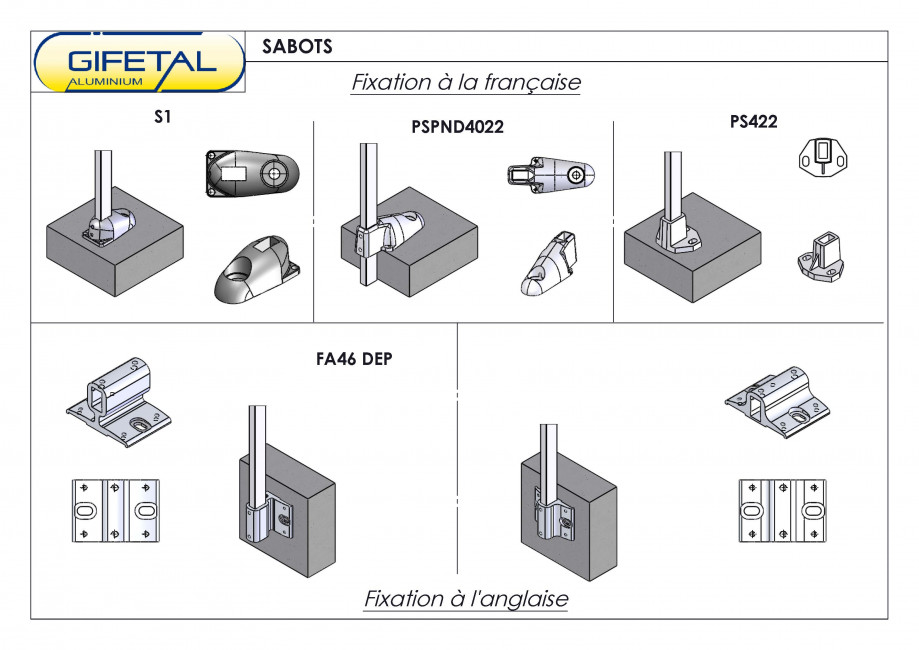 – Pose sur dalle par sabot 1 trou alu moulé forme aile d’avion (type S1)