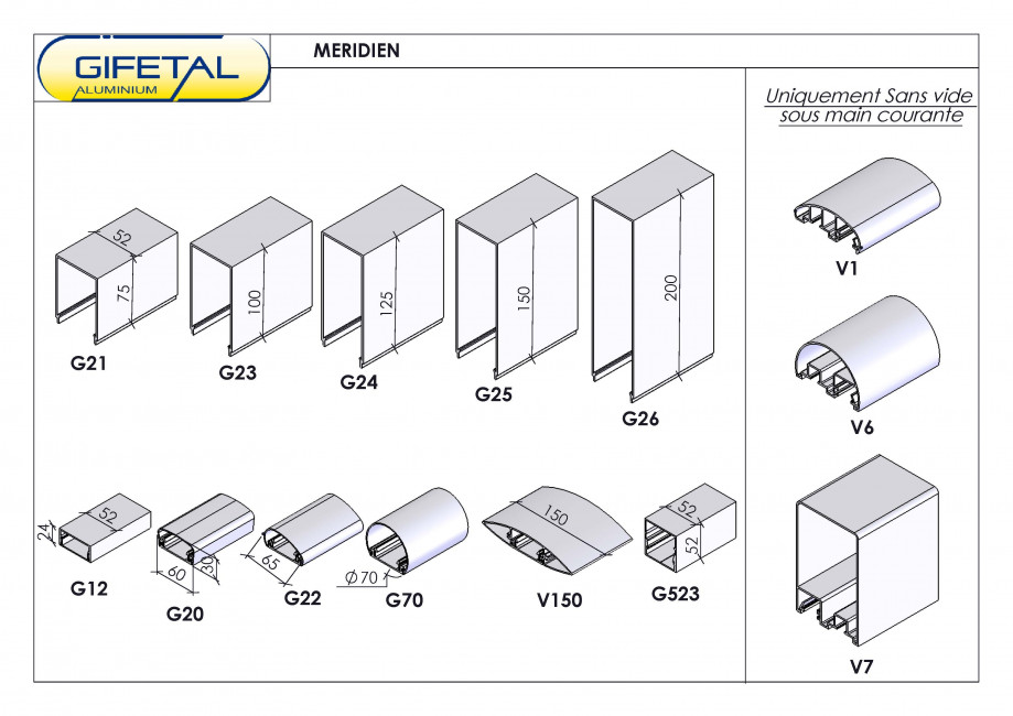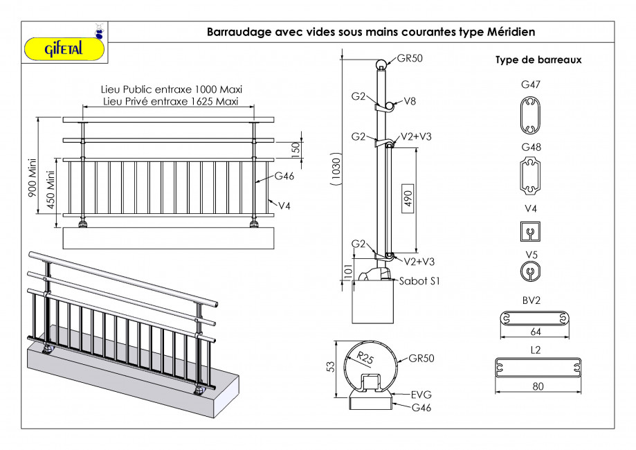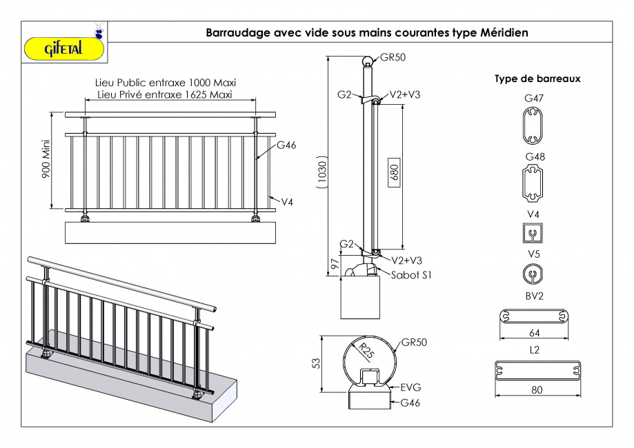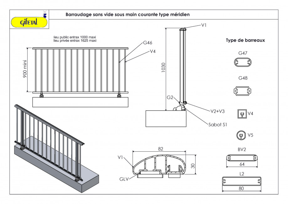 - Configuration : sans vide sous main courante, avec vide sous main courante et avec une ou plusieurs lisses intermédiaires.