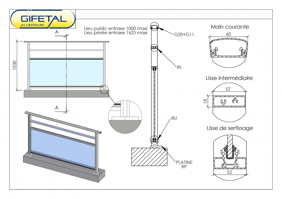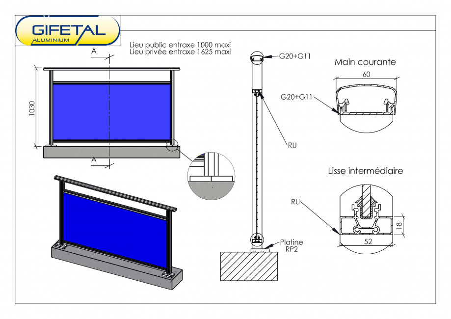 - Vitrage pris en feuillure sous la main courante rectangulaire réf : G20 (60 x 30 mm), et pris en feuillure dans la lisse basse réf : RU (52 x 18 mm), fixé entre les poteaux.
