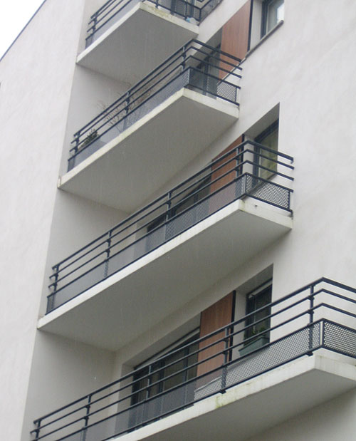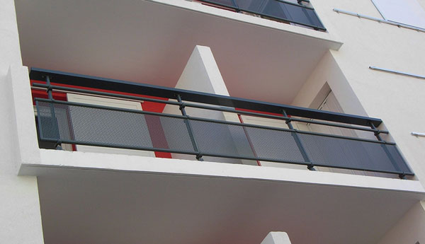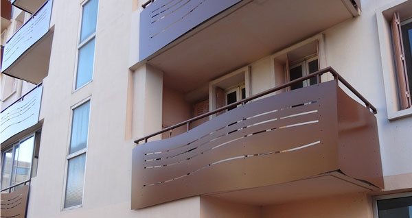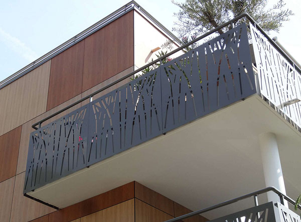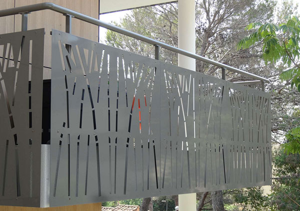 Garde corps de protection avec remplissage en tôle aluminium stratifié, perforé ou non, proposé avec maille carrée ou en version personnalisée. Les rempliss