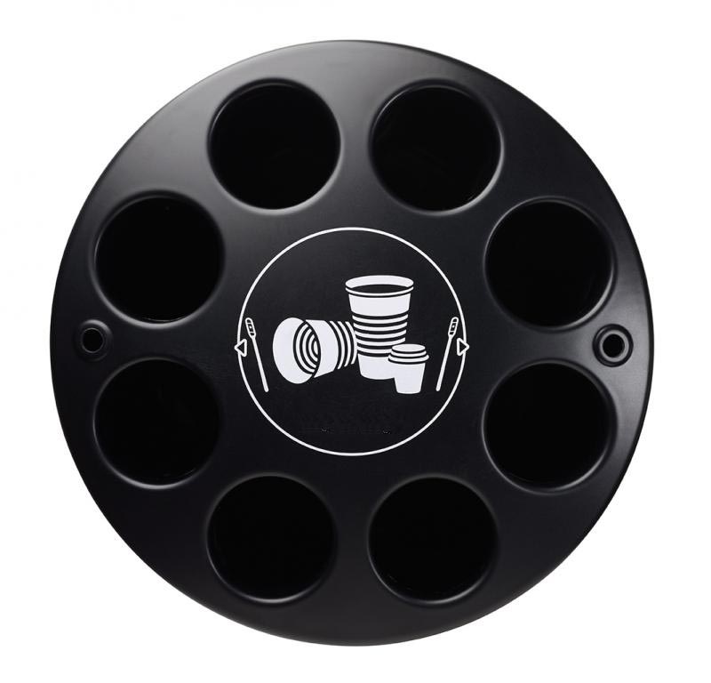 Le réceptacle pour gobelets accepte tous les formats jusqu'à 70 mm de diamètre, couvrant ainsi l'ensemble des gobelets plastique standards.