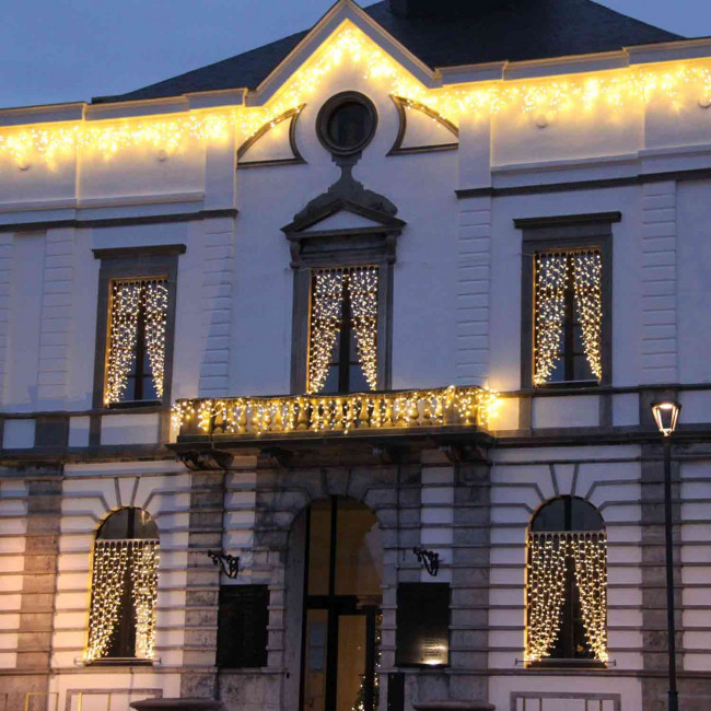 Dimensions (H x L) : 6 x 2 m Usage intérieur et extérieur Couleur des leds : blanc chaud ou Blanc froid 230V / 64W 980 ampoules Lot de 2 guirlandes