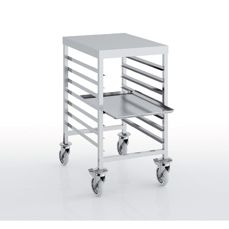 Cet équipement de cuisine offre un déplacement facile grâce à ses 4 roues pivotantes insonorisées Ø125mm dont 2 avec freins et pare-chocs en gomme.