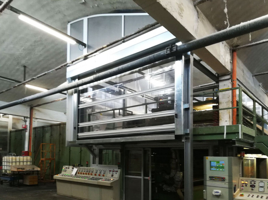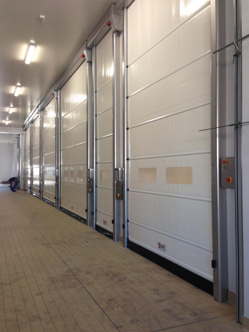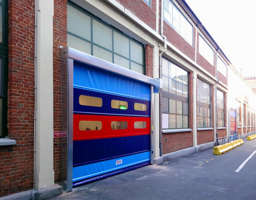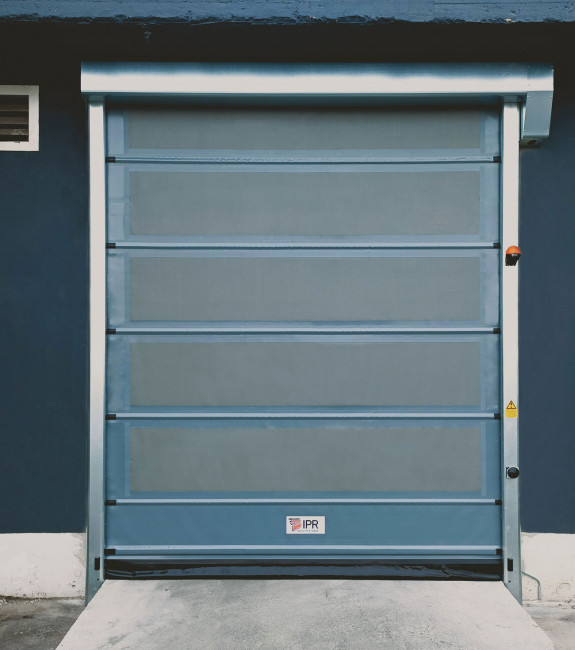 Cette porte à enroulement rapide avec traverses rigides facilite le trafic de la manutention et des véhicules.