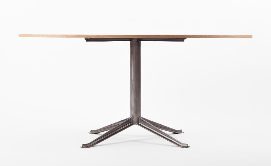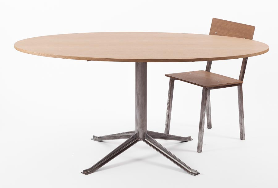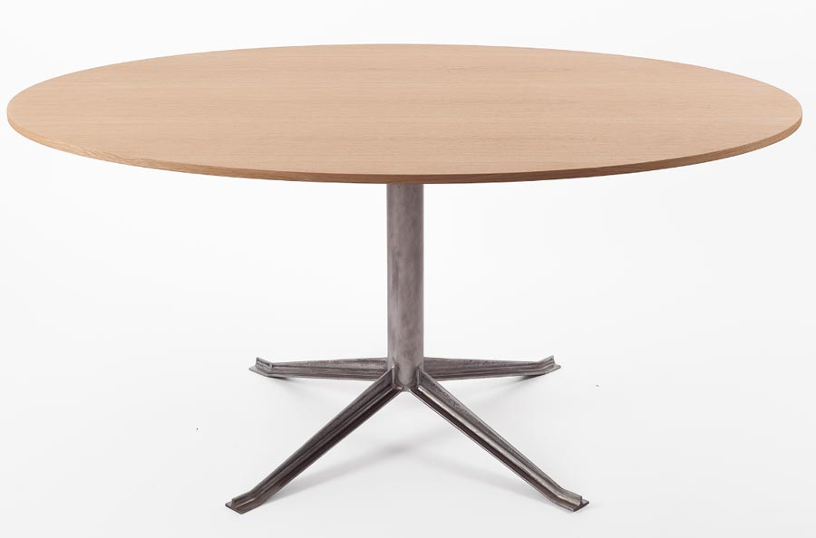 Le plateau est réalisé en plaqué de bois véritable (noyer américain ou chêne) et repose sur un piétement en acier soudé et poli à la main.