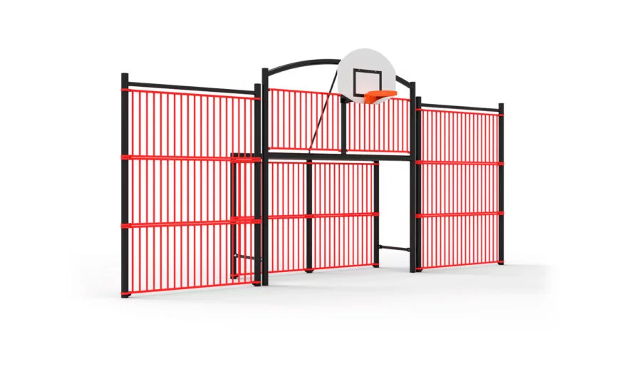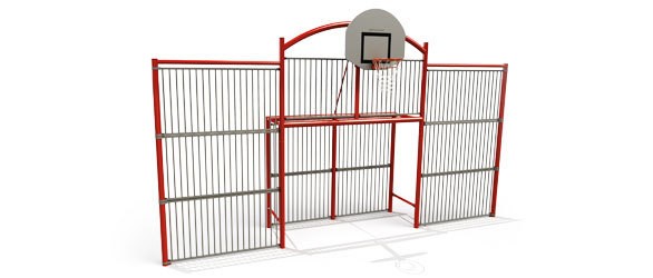 La partie basket intègre un cercle en fer plat et un panneau 1/2 lune PEHD 1200 x 900 x 20 mm avec hauteur réglable à la pose de 2,60 m à 3,05 m pour s’adapter selon l’âge des utilisateurs et le niveau de jeu attendu.