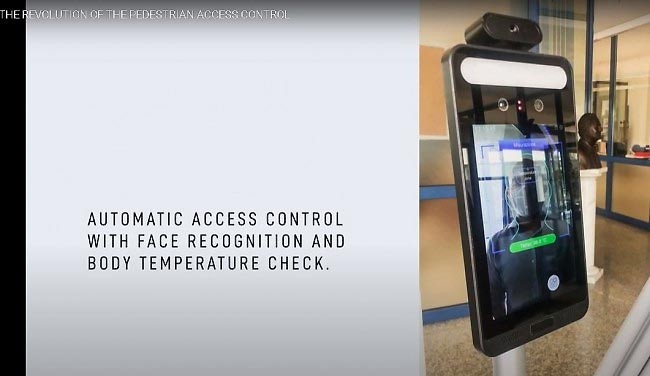 Reconnaissance faciale : reconnaît les traits du visage et autorise l’accès uniquement au personnel autorisé, ou autorise l’accès à tous après vérification de la température et de l’EPI, mais enregistre l’heure d’entrée / sortie du personnel autorisé.