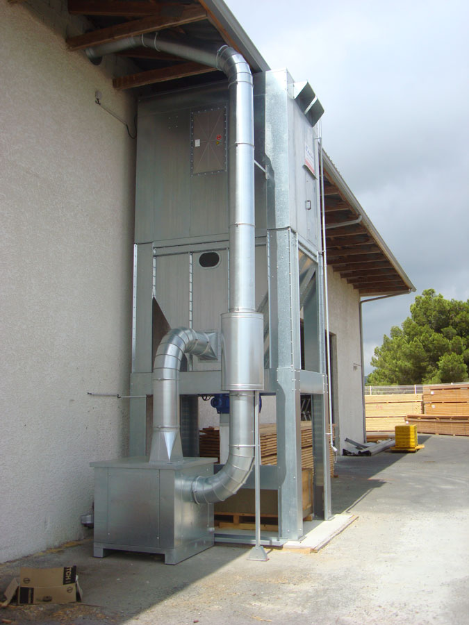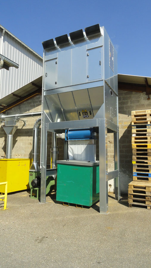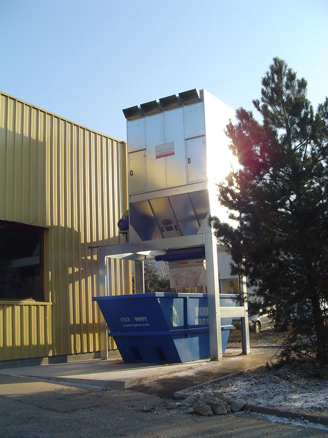 Filtres destinés à l'aspiration de copeaux ou particules de bois ou de plastique. Evacuation des déchets via une écluse rotative en partie basse de la trémie.