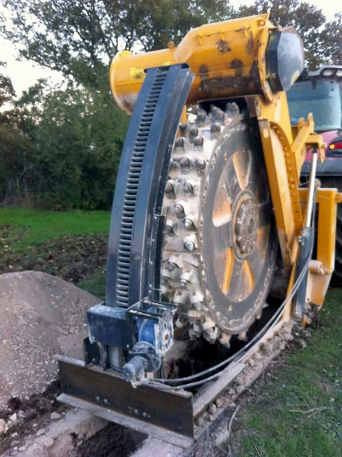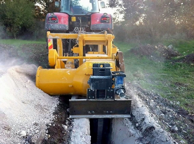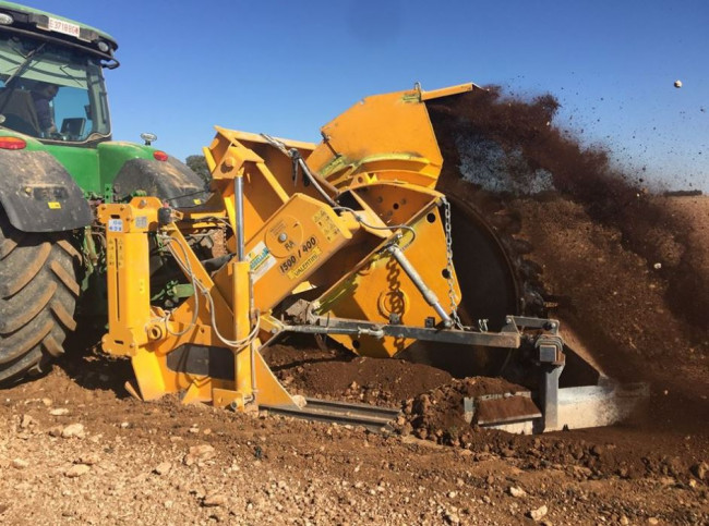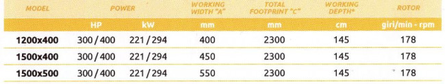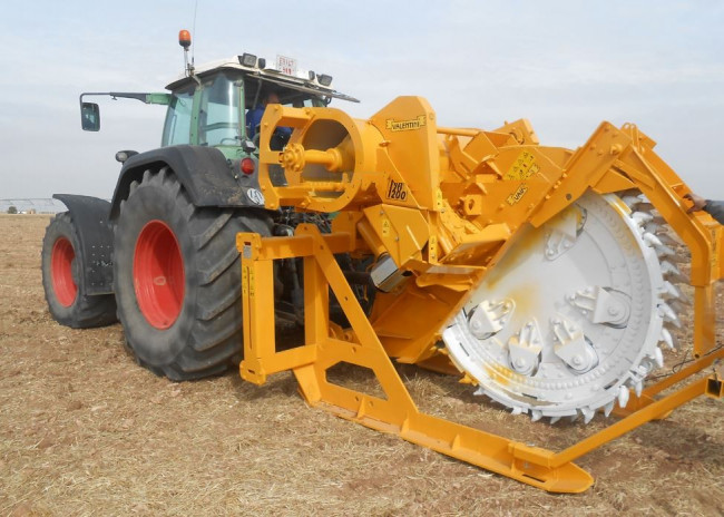 La trancheuse Valentini RA 1100-1500 permet de travailler dans le sol jusqu’à 145 cm de profondeur, elle se décline en deux largeurs de travail 450 et 550 mm. Il faut un tracteur de 300 à 400 CV pour l’entrainer. Son rotor tourne à 178 tours/min et elle pèse suivant la version 6800 ou 7200 kg.