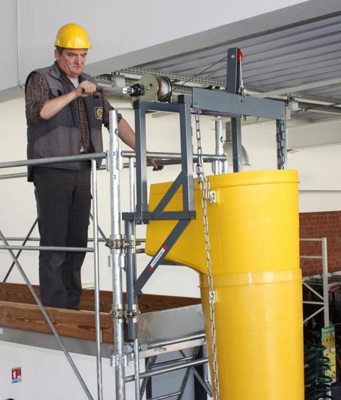 - Treuil manuel pour faciliter l'élévation et la fixation d'une descente de goulottes sur un chantier