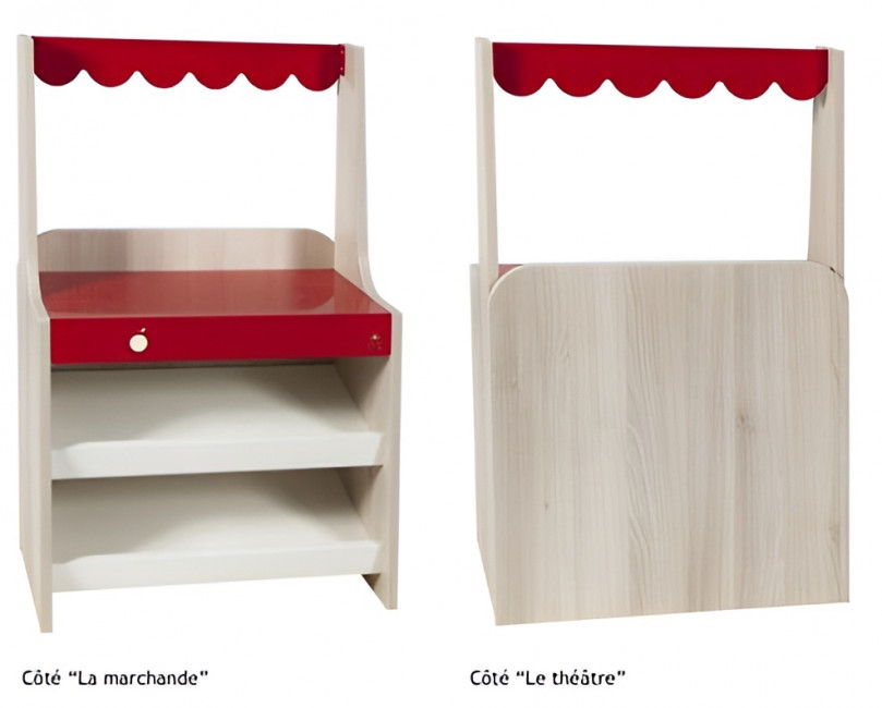 Mobilier deux-en-un : la face “marchande” encourage le jeu de commerce, tandis que la face “théâtre” stimule les scènes de représentation. Adapté aux espaces collectifs et facile à intégrer dans tous les univers pédagogiques.