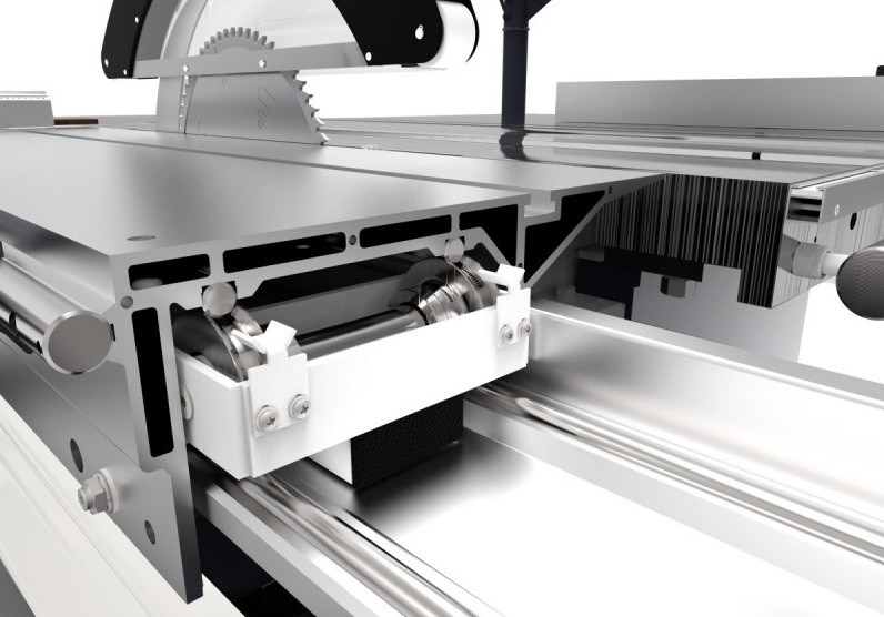 Le chariot à quatre roulements en aluminium anodisé assure une grande résistance à la torsion, tandis que le serrage de la lame de scie sans outil par "Rapid-System" simplifie les opérations d'entretien et de changement de lame.