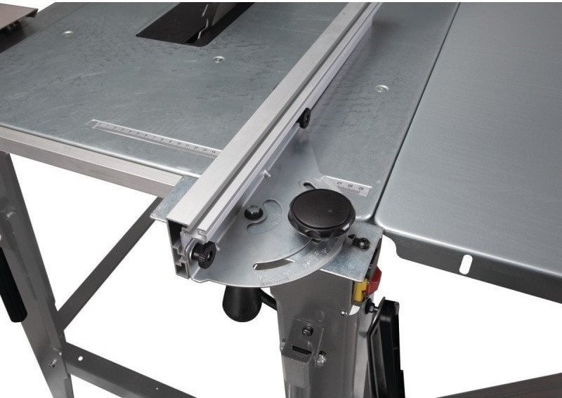 - Chariot monté sur roulement à billes avec butée réglable et guide coulissant pour des coupes précises et sécurisées