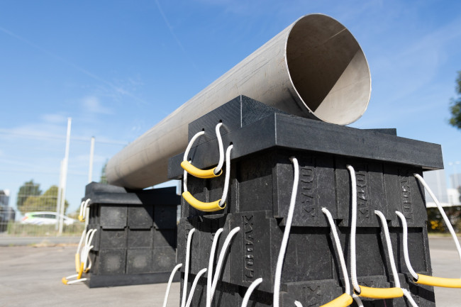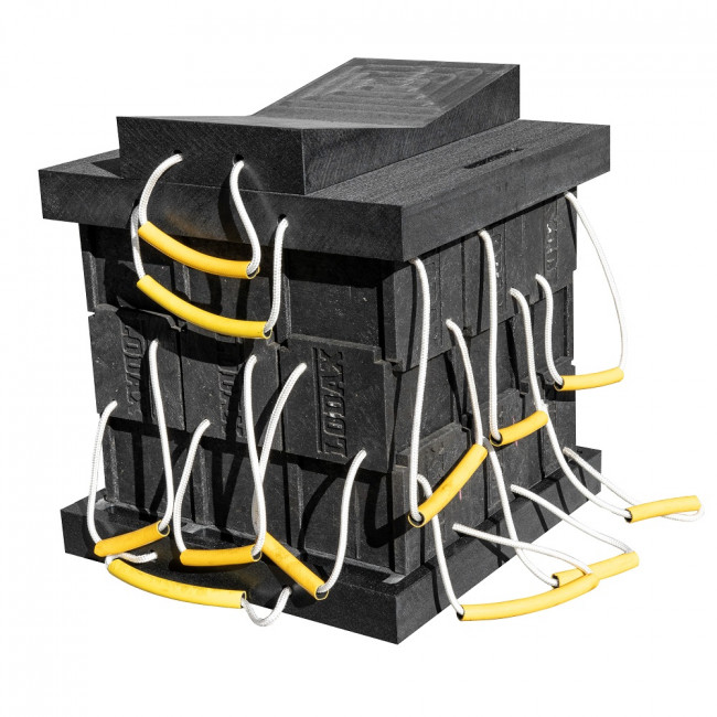 Le but est d"empiler quatre palettes en béton de dimension environ 1450 mm de longueur et de largeur et 250 mm de hauteur. Chaque palette est séparée par 2 chevrons permettant leur manutention.