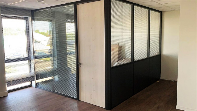 Pour une séparation d"un local en angle 90° séparation en double vitrage vitrage semi-hauteur, profilé noir cloison blanc, et 1 porte vitré