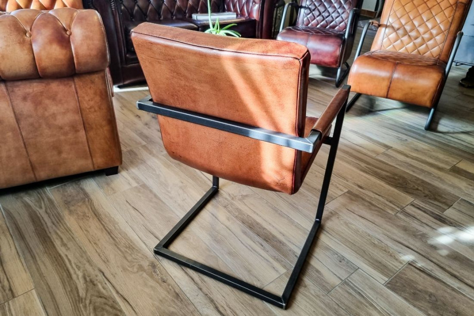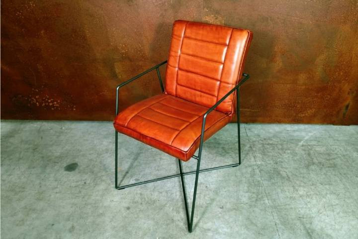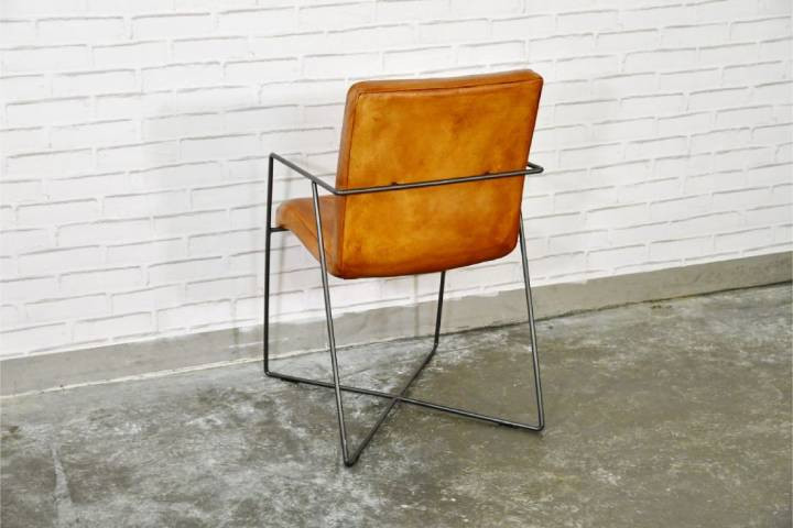Cette chaise au design original et soigné, pensée pour les intérieurs exigeants, marie un cuir de veau pleine fleur d’origine française à une structure en acier brut au style industriel affirmé.