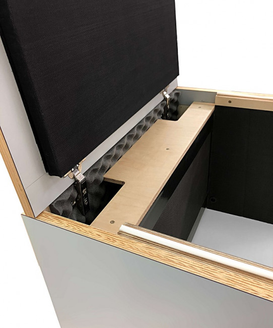 - Les parois intérieures sont recouvertes d’un matériau acoustique absorbant et recouvertes de tissus en fibre de verre lavable et résistant à la chaleur