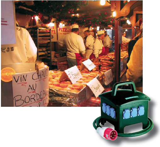 Coffret électrique spécialement conçu pour alimenter en électricité des installations provisoires lors des fêtes foraines et des foires. Il est conforme à la norme NF C 15-100 partie 711.