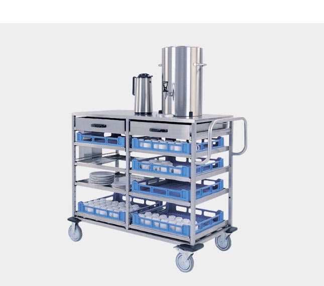 Ce chariot de cuisine est l’équipement professionnel destiné pour transporter des paniers à vaisselle des tasses, soucoupes et couverts.