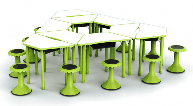 Sa forme trapézoïdale lui permet de s'adapter à différentes configurations pédagogiques : enseignement frontal, travail en groupe, ateliers, classes flexibles, etc.