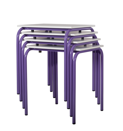 Grâce à sa fonctionnalité empilable, la table scolaire RAJA s’empile facilement, permettant jusqu’à 4 tables superposées sans risque d’endommager les plateaux grâce aux butées spécifiques.
