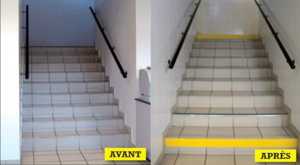 Il est obligatoire que la première et la dernière marche soient contrastées visuellement sur une hauteur de 10 cm.