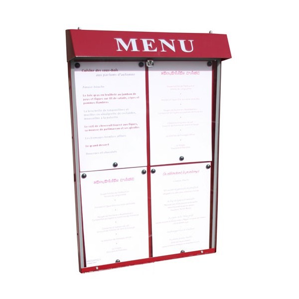 Cette vitrine porte-menu murale est destinée pour usage extérieur, avec une capacité d'affichage pour 4 pages .