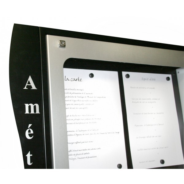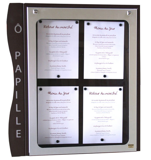 Ce porte-menu mural simple face est doté d'une capacité d'affichage de 4 pages, pour usage extérieur.