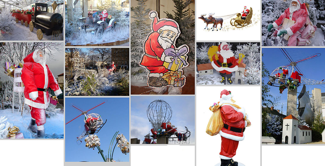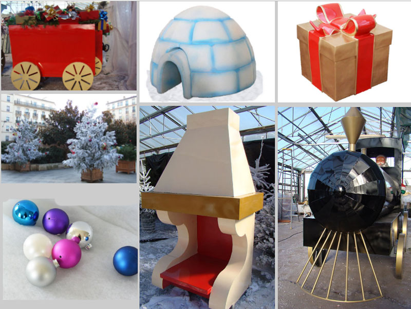 - Dans nos ateliers prennent forme le petit train du père Noël ou son hélicoptère, sa fusée, son traîneau, autant d’éléments que nous louons ou vendons et que nous installons dans les espaces urbains tels les ronds points, les parvis de mairie, les parcs, les halls d’entrée.