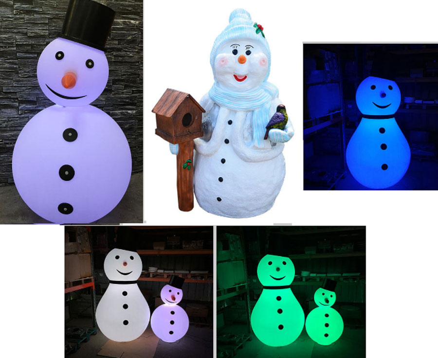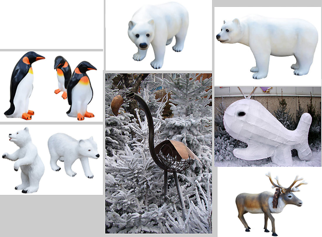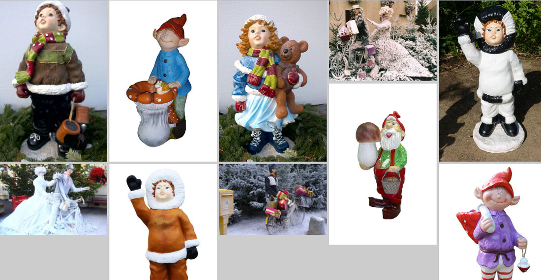 - Un catalogue complet de personnages et d’animaux en résine, Bonhommes de neige, Pères Noël, traîneaux du père Noël, rennes, ours, ourson, pingouin, Igloo, nous permettrons de créer des scènes hivernales et une ambiance de Noël qui éblouira petits et grands.