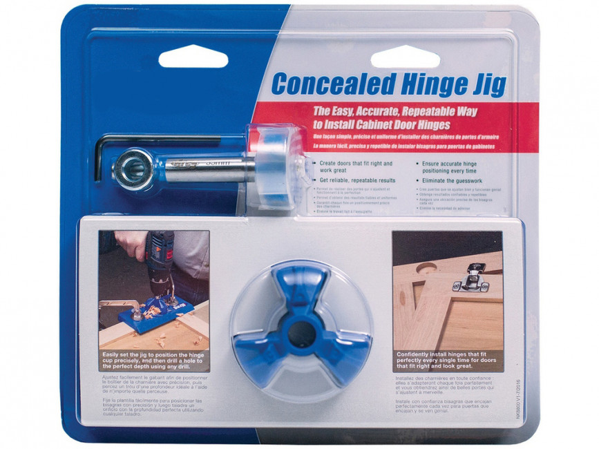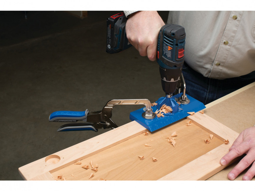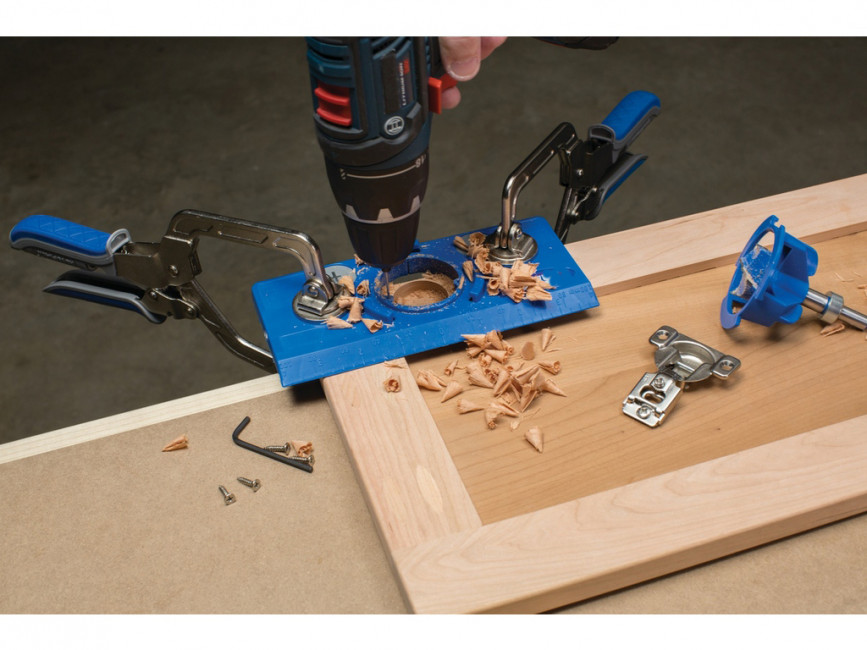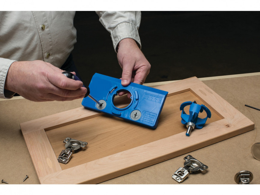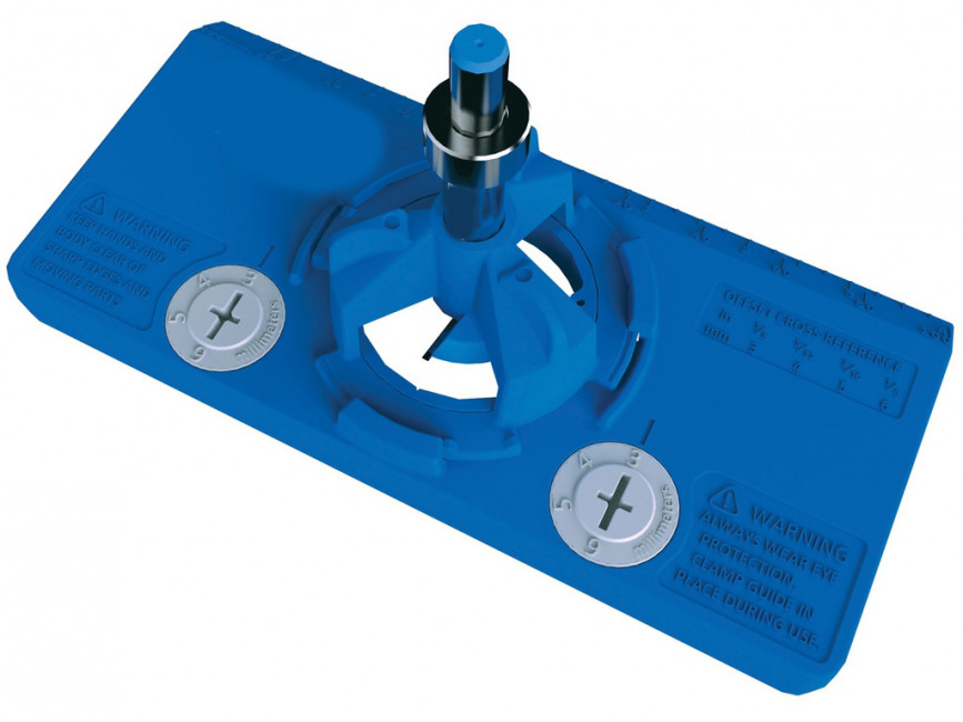 Ce gabarit est livré avec une base de gabarit avec cames d'index, un guide de perçage, une foret à pointe en carbure de 35 mm, un collier d'arrêt avec clé hexagonale et un mode d'emploi.